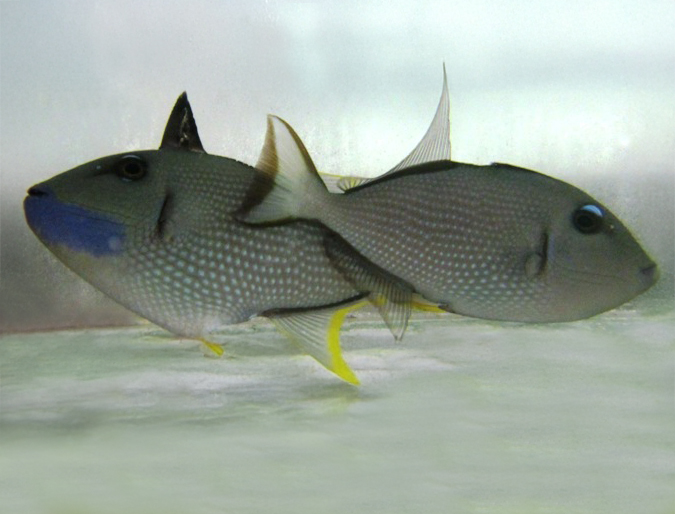 The Blue Jaw Triggerfish, also known as the Blue Throat Triggerfish, Gilded Triggerfish, or Blue-Throated Triggerfish (Xanthichthys Auromarginatus), is a spotted gray species native to the Indo-Pacific islands. Males feature blue cheeks and yellow-bordered white fins, while females lack the blue throat patch and yellow tail. Instead, they display a striking blue ring around their eye and a beautiful lavender-gray-blue body with gray to white spots, creating a unique linear pattern. Known to be reef-safe, Blue Jaw Triggerfish have a varied diet that includes meaty crustaceans and fish flesh. They are also famous for spitting water out of the tank to get attention for treats. These fish can be kept in small groups consisting of one male and two or more females or as a simple mated pair, creating a peaceful and visually captivating display.